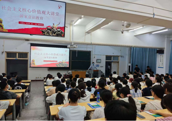 班会伊始,王仁举以“国家意识”为主题展开社会主义价值观教育宣讲。他首先讲解“国”的文字演变,从甲骨文“或”(戈护城邑)到金文“國”(疆域+武力守卫),再到简化字“国”(疆域内有珍宝)。他讲到“国”字本身承载着“守护、疆域、共同体、繁荣”的核心内涵,也为国家意识教育提供了生动的文化锚点。他的讲解强化了2025级新同学对国家历史、文化与高质量发展的认知,大大提升了他们的民族认同感与自豪感,坚定了“强国有我”的理想信念。