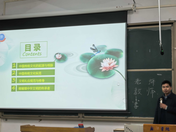 王老师介绍了文明礼仪的内容、基本原则和常用文明用语,强调了校园礼仪的重要作用,涵盖了图书馆、医院等场所的礼仪规范,如校园里电动车时速不超15码、禁止抽烟等,引导员工从身边小事做起,践行文明礼仪。他还介绍了琴棋书画、传统文学、传统节日、中国传统戏剧、语言文字、传统医药医学等丰富内容。他以专业课数学分析学习为例,强调学习要把握事物的变化规律,正如传统文化虽历经岁月变迁,却依然绽放光彩。他认为讲文明源于礼仪,对个人和社会都具有十分重要的意义。他以“苦心人,天不负,卧薪尝胆,三千越甲可吞吴。有志者,事竟成,破釜沉舟,百二秦关终属楚。”为寄语,希望同学们肩负起传承和弘扬中华优秀传统文化的重任,将文明礼仪融入日常生活,做有理想、有道德、有文化、有纪律的新时代青年老员工。