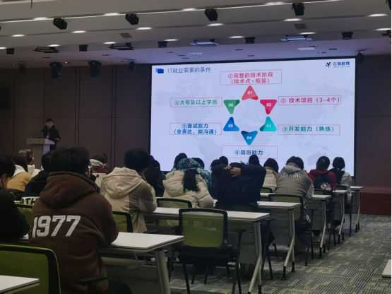 参观结束后,河南省新投云软件开发有限公司副总经理徐光辉在报告厅做专题分享。他给出企业近两年的校招数据:数据分析岗位占统计学投递量的68%,起薪区间7-12K;嵌入式、云端开发岗位需求增长约30%,对应要求掌握Python、SQL及线性代数基础。徐光辉建议员工大二前完成代码能力达标,大三参与实际项目,并提前关注考公、考研及行业证书路径。