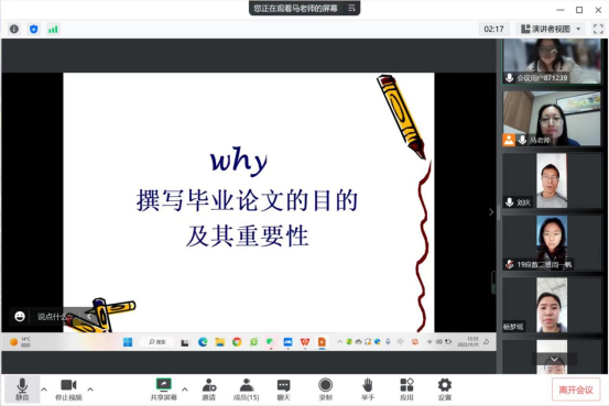 会上,首先是刘庆老师针对毕业论文的命题和选题、指导教师安排、开题报告撰写、毕业论文初稿提交要求等内容进行了详细的讲解,提醒各位同学在准备论文过程中,注意论文材料的提交时间节点,合理安排写作时间。接着是马聪变老师强调了毕业论文撰写的重要性和严肃性,要求同学们高度重视毕业论文写作的任务,论文内容方面需要凸显专业性与应用性,并且必须遵守学术诚信的基本原则;论文需要依照写作规范和课题要求,不仅要能经得起论文抽检的考验,也要保证论文能够真正运用所学习的专业知识来解决实际问题。最后是答疑环节,部分同学们根据自己存在的疑问向老师进行提问,两位老师针对这些问题进行了详细解答。