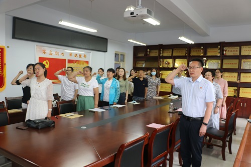 在庄严的国歌声中主题党日活动拉开了帷幕,全体教师党员在魏双飞的领誓下一起重温入党誓词,砥砺入党初心使命。
