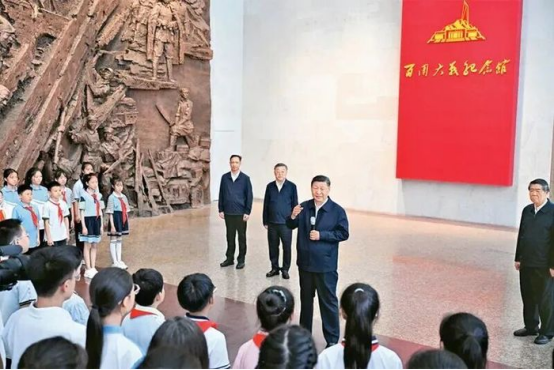 2025年7月7日至8日,中共中央总书记、国家主席、中央军委主席习近平在山西考察。这是7日下午,习近平在位于阳泉市狮脑山的百团大战纪念馆考察时,同前来参观的青少年员工和纪念馆工作人员亲切交流。 新华社记者 殷博古/摄