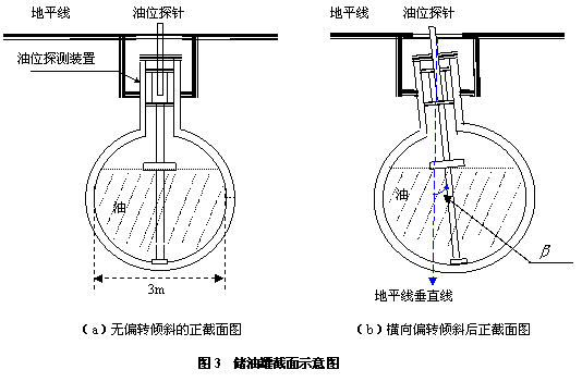 许多储油罐在使用一段时间后,由于地基变形等原因,使罐体的位置会发生纵向倾斜和横向偏转等变化(以下称为变位),从而导致罐容表发生改变。按照有关规定,需要定期对罐容表进行重新标定。图1是一种典型的储油罐尺寸及形状示意图,其主体为圆柱体,两端为球冠体。图2是其罐体纵向倾斜变位的示意图,图3是罐体横向偏转变位的截面示意图。