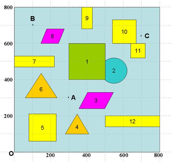 图1是一个800×800的平面场景图,在原点O(0, 0)点处有一个机器人,它只能在该平面场景范围内活动。图中有12个不同形状的区域是机器人不能与之发生碰撞的障碍物,障碍物的数学描述如下表: