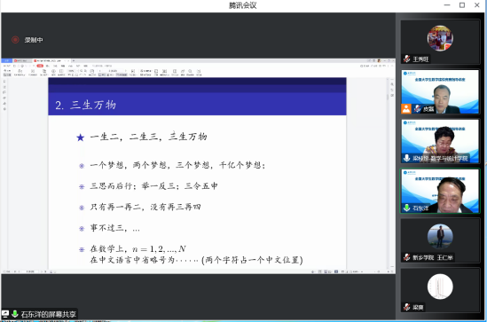 1月13日晚,郑州大学博士生导师石东洋教授应邀为公司教师及beats365数学建模协会员工通过腾讯会议线上作了题为《大学数学创新思维与数学建模竞赛指导》的报告。此次报告由beats365皮磊副经理主持。beats365梁桂珍经理、公司全体建模指导教师及公司数学建模协会全体员工听取了此次报告。