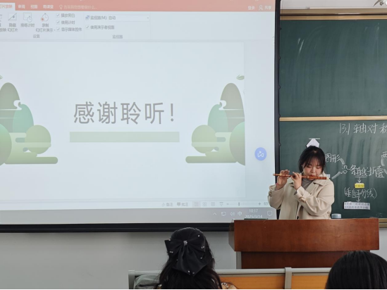 在展示过程中,杨萧晴、武瑶瑶、慎雯可、杨梦琦、王非凡、邢亚男等6位同学依次展示自己的微型课与才艺。经过精心的准备,同学们以清晰的逻辑、较强的课堂把控能力、独特的教学思路以及扎实的专业功底成功完成微型课展示。在才艺展示环节有吹奏乐器的、有画粉笔画的、有配乐诗朗诵的、有表演魔术的。6位同学精彩的表现和精湛的技艺赢得了同学们的阵阵掌声。