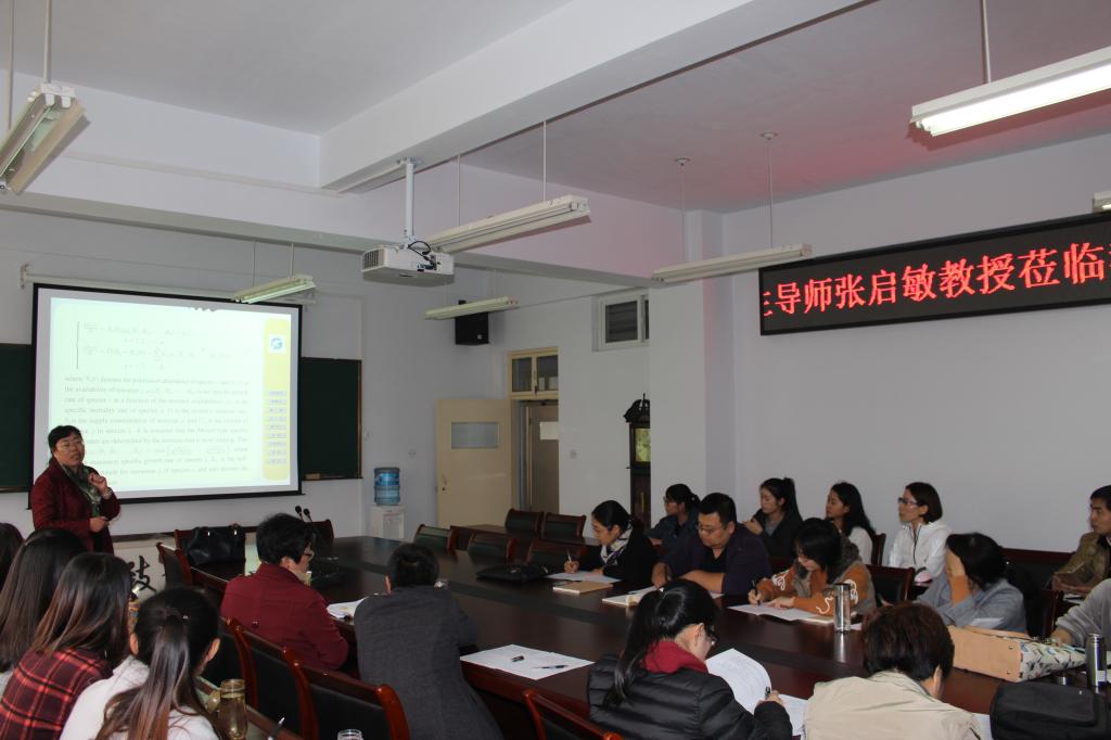 张教授首先给出了所研究的带有分数布朗运动的随机微分方程模型,并对模型中的变量从生物种群、经济学等方面的代表的具体意义进行说明,接着给出确定性系统及随机系统中相互转化的方法和途径,然后给出两个实例并讲解如何对模型进行求解与仿真,最后张教授就自己近年来在项目申报及论文研究的一些经验分享给大家。在互动环节中,张教授一一解答了师生提出的一些问题。