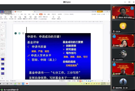张兴安从国家自然科学基金项目的选题具体有限化、摘要凝练、评审人角度、创新性等方面,就申报书的撰写包括立项依据、研究内容、研究目标、关键科学问题、技术路线、可行性分析、创新点、年度计划、预期结果、工作基础和经费预算等内容,通过具体详实的案例进行了讲解。