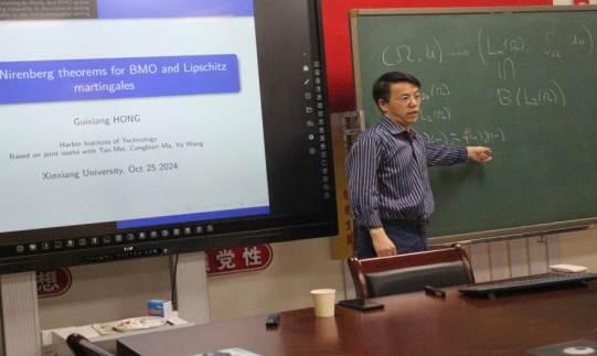 洪桂祥教授报告的题目是《John-Nirenberg inequalities for noncommutative BMO martingales》。在报告中洪教授首先深入浅出的为大家对比了经典的概率空间和非交换的算子空间的联系和区别;然后介绍了他与本院教师马聪变近期的一个重要工作--证明了非交换鞅空间上的John-Nirenberg不等式。