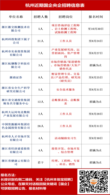 招聘信息:杭州近期一大波优质岗位汇总来啦!国企/政府机关/事业单位