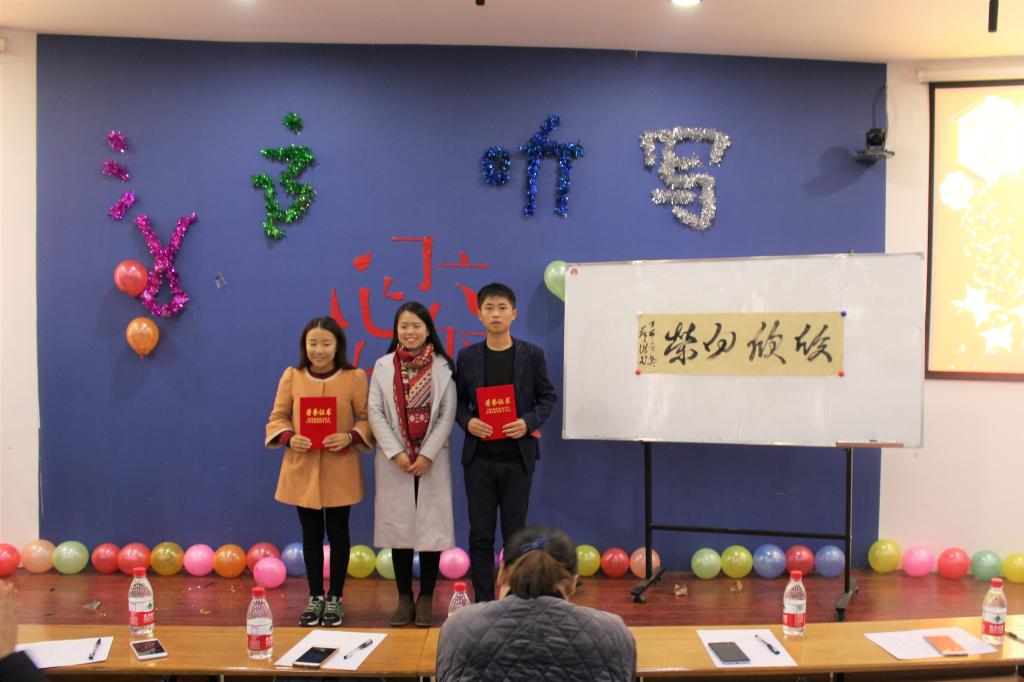 此次大赛分为四库全书、你比我猜、诗词抢答三个环节,共六支队伍参加。在你比我猜环节中,每支队伍通过夸张地肢体动作来表演大屏幕上出现的词语,诙谐的动作惹的现场的观众捧腹大笑。接下来的游戏环节,在场观众积极的参与其中。最后书法协会的特邀嘉宾用书法作品“欣欣向荣”四个字表达了对数学公司的美好祝愿。经过三轮的激烈角逐,“一阵妖风”组凭着默契的配合和丰富的文化知识脱颖而出,夺得此次比赛的冠军。至此,此次汉字听写大赛圆满结束。