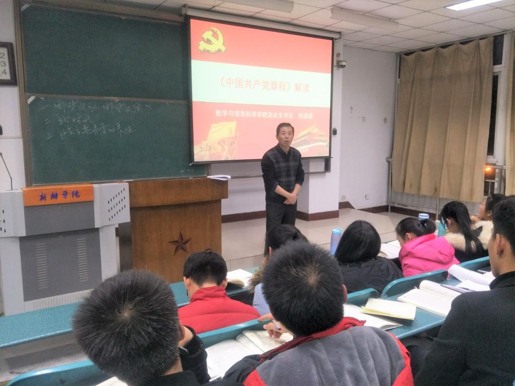 为了使入党积极分子更加坚定理想信仰,数学与信息科学公司党总支书记刘洪波老师于12月4日晚七点在A05-501教室开讲党课培训第一课,主题为解读十九大新修订党章。