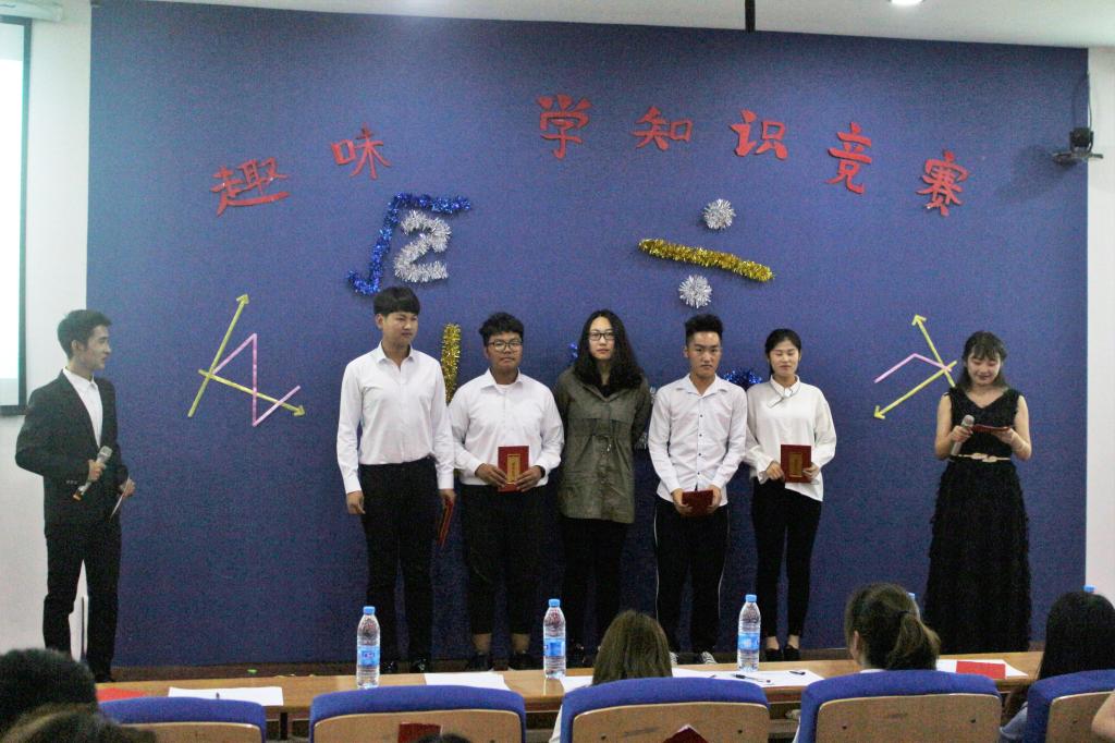 经过初赛和复赛的层层选拔,四组选手脱颖而出。此次趣味数学知识竞赛决赛分为快问快答题、组装散落数独和附加题三个环节。在第一个环节中,各队已经初露锋芒,实力旗鼓相当。在组装散落数独环节,参赛选手各尽其力,为解答数独难题绞尽脑汁。第三个环节的附加题更是选手们大显身手的时候,此环节不但需要沉着冷静,更需要集体的智慧,选手们都在认真的进行商讨和抉择。经过激烈的角逐,第四组参赛选手取得了第一名的好成绩,李峥老师为其颁奖。至此,此次趣味数学知识竞赛圆满结束。