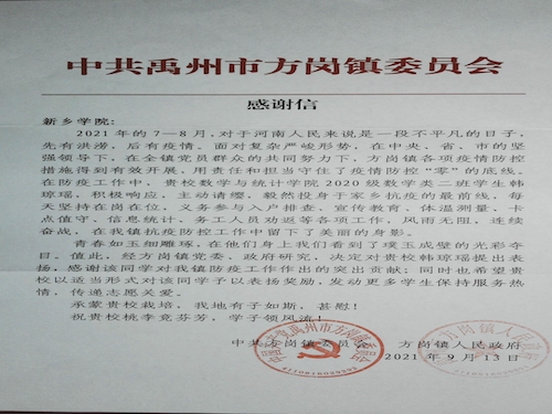 2020级信息与计算科学一班韩琼瑶同学密切关注疫情形势,在暑假期间积极参与疫情防控工作,毅然投身于家乡抗疫的第一线,以实际行动践行新时代青年的责任与担当。做志愿者期间,韩琼瑶同学风雨无阻,坚守在抗疫最前线,积极参与入户排查、体温检测、统计返乡成员信息等各项工作。韩琼瑶同学以实际行动践行无私奉献、乐于助人的志愿服务精神,获得了禹州市方岗镇委员会的高度认可,并予以鼓励和表扬。