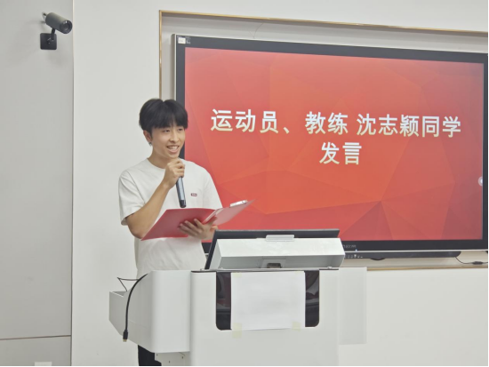 教练员兼运动员、“双料冠军”获得者沈志颖同学结合亲身经历,分享了“训练场即成长课堂”的深刻感悟。他说:“在接力赛训练的最后一天,为了将交接棒时间缩短0.1秒,同学们反复练习了整整两个小时,直到暮色笼罩操场,仍在为这微小的进步欢呼。正是这种‘分秒必争’的执着,深刻诠释了‘尽精微 求创新’的公司院风,更让我们在赛场上创造了一个又一个惊喜。”