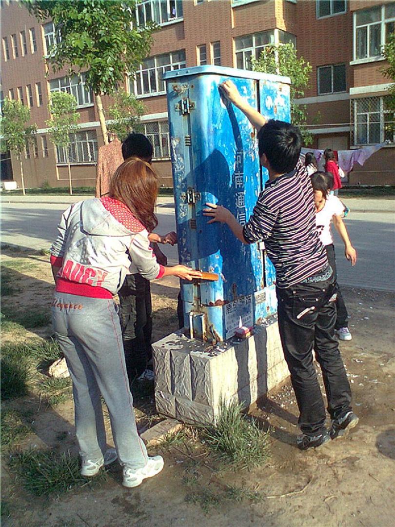 在各班同学的配合下,活动进行得非常顺利。同学们自备了抹布,水盆等清洁工具,积极地投身于活动中。尽管阳光强烈,但同学们依然干劲十足。大家或揭或撕或擦,细心认真,争取不留一丝残迹。汗水从同学们的额头上一滴滴流下,但没有人喊累,反而都笑了,大家都觉得劳动最光荣。随着时间的推移,灯杆、树木、垃圾箱等上面的污渍逐渐被清理掉,又变得焕然一新。