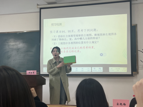 接着,田思思为同学们带来了一堂精彩的示范课。她以人教版数学九年级下册29.2《三视图》一节为例,通过巧妙的设计和生动的讲解,逐步引导员工掌握数学方法及其应用的教学过程,为同学们展示了一节精心设计和有效实施的微型课成功范例。在示范课中,田老师注重培养员工的思维能力,鼓励他们大胆提问、积极思考,课堂气氛活跃。田老师使用希沃白板等教学软件和实物教具,让课堂变得更加生动;她巧妙设置提问环节,增强了与员工之间的互动性;她在教学过程中还引入了《题西林壁》这首诗,把数学知识与中国传统文化巧妙融合,增加课堂内涵,让员工不仅形成了数学的理性思维,更积淀了千年文化的底蕴,进而发展了核心素养。在座的同学们深受启发、收获颇丰,同时也被田老师深厚的专业功底和娴熟的教学技能所折服。
