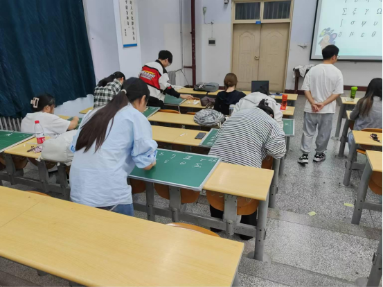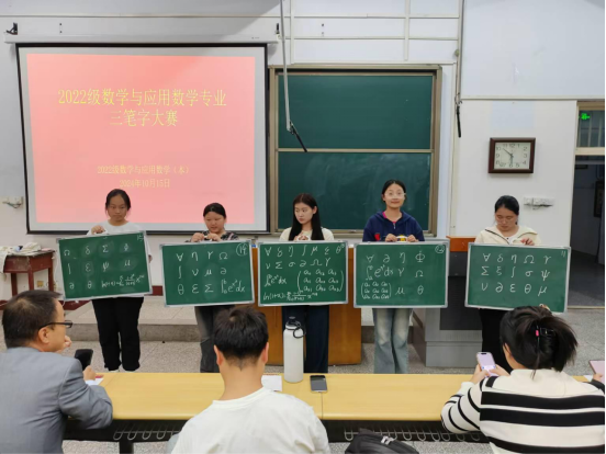 为了丰富校园文化生活,为师范生营造至善至美的校园文化氛围,鼓舞师范生写出较好粉笔字,弘扬传统文化,提高师生审美情趣。2024年10月15日晚上,由2022级数学与应用数学班委成员主办的“汉字和数学符号粉笔字书写大赛”在A01-224教室顺利举行。此次比赛诚挚邀请皮磊老师、赵守娟、张玲瑞和周贵祥4位老师,以及上一届三笔字大赛第一名周士琪同学、第二名杨茹晴同学、第三名刘璐同学作为评委,参赛成员为22级数学与应用数学的28名同学。赛后,各位评委指出了参赛同学书写的优缺点,并且颁发了一二三等奖以及参与奖,最后由评委老师和获奖同学合影留念。总体而言,本次师范生三笔字大赛是一次非常成功的活动,同学们在比赛中展现出了较高的水平和良好的精神风貌。通过这次比赛,22级应数的同学们也认识到了自己在三笔字书写方面存在的一些优点和不足之处,并且能够以此次比赛为契机,继续加强练习,不断提高自己的三笔字书写水平,为今后成为一名优秀的教师打下坚实的基础。