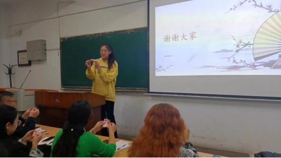 活动开始,刘美玲等5位同学逐个上台进行不超过十五分钟的说课和不超过五分钟的才艺展示。同学们说课时仪态自然大方、风格迥异,不但设计制作了精美的课件,还能用清晰、准确的语言表达出自己的观点和想法,充分彰显了各位选手的理论功底与教学技能。同时,她们在才艺展示环节也是各显神通,表演了剪纸、诗朗诵、粉笔画等才艺,充分展现了她们的综合素养和个人魅力。