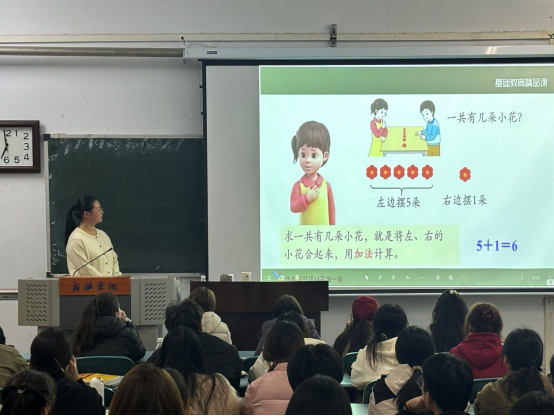 孙萍老师首先进行了《6和7的加减法》教育精品课的视频展示。她巧用多种AI工具,语言生动形象,人物丰富立体,讲解浅显易懂,在几分钟的视频展示过程中充分展现了新一代青年教师在与时俱进的过程中所具备的专业素质与教学技能。她又围绕七个步骤详细阐述了教育精品课的制作方法。从“如何选课”到“根据教学设计撰写逐字稿”,她指出逐字稿的制作尤为重要,应注意标注清晰。在“根据教学设计制作课件”到“合成剪辑、上传作品”环节,她结合自身经历为同学们提供了多种实用性操作技巧。