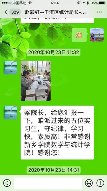 近日,好消息传来。在新乡市卫滨区统计局实习的吴松锦、刘佳瑞、赵慧芳、陶艳、高晓茹等5名同学的工作能力和个人素质得到了实习单位领导赵彩虹局长的高度评价。