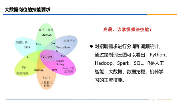 王标老师还谈及了同学们比较关心的岗位薪酬情况,又从招聘需求的角度通过分词和词频统计绘制了词云图,给同学们直观展示了Python、Hadoop、Spark、SQL、R是人工智能、大数据、数据挖掘、机器学习的主流技能,最后王标老师给同学们安排了未来两周实训内容。
