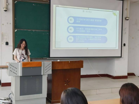主题班会上,首先是2021级数学与应用数学专业1班学习委员傅佳盈从班级日常管理、突发情况应对策略、家校合作与沟通、提高班主任自身能力与素养、强化团队合作意识、增强员工自我管理能力、构建和谐班级文化等七个方面对班级管理教育工作要点和方法进行具体的说明,为同学们在以后的教育实习中更好地进行班级管理打下基础。