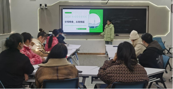 翟星琪同学带来主题为《珍惜粮食,从我做起》的班会课。班会以校园餐饮浪费现象为切入点,以局部缩略图猜食物的小游戏引入主题,激发了员工的兴趣与好奇心。班会上,条理清晰地介绍世界粮食日的历史与意义,采用小小演说家、观看“粮食浪费”公益影片的方式,让员工深刻认识到粮食的重要性,引起员工的思考。最后采取小组讨论,师生共同探讨消费习惯与节约方法,并在节约粮食承诺书上签名表决心。翟星琪同学以校园实例为引,加上生动的讲解,课堂氛围活跃,展现出良好的师生互动,成功引导员工认识到珍惜粮食的重要性。