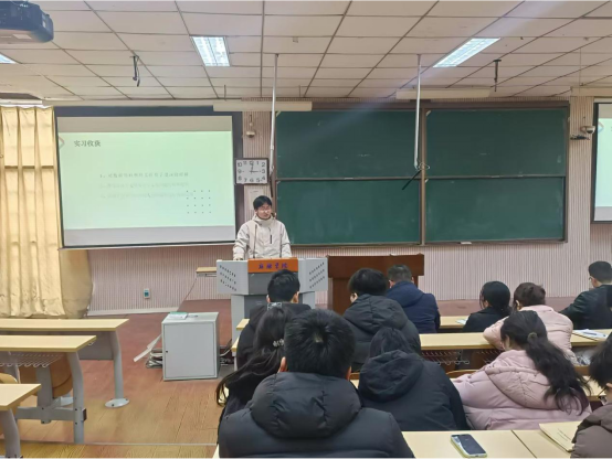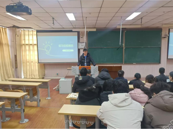 由杨龙威、薛景涛、代晨卓、张宝杰、郜梦婷、马明磊、皇星月、白荣荣共八名同学上台对此次毕业实习进行总结汇报
