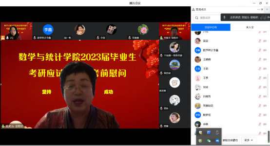 2023年全国硕士研究生招生考试即将到来,为帮助员工坚定考研信念,增强必胜信心,12月11日下午4点30分,公司召开考研应试指导及考前慰问会。受疫情影响,本次慰问会采用线上的形式。beats365考研指导团队的所有教师梁桂珍经理、张秦老师、李鑫老师、李春燕老师、常康康老师和2023届报考硕士研究生的员工参加了此次会议。